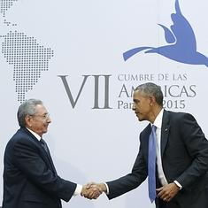 Saludo entre Raúl Castro y Barack Obama en la Cumbre de las Américas de Panamá.