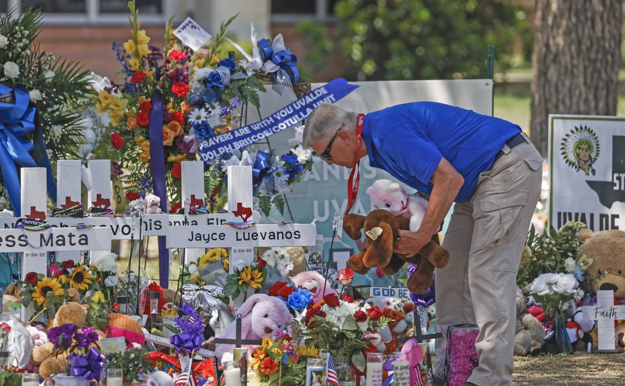 Un voluntario ayuda a colocar las decenas de flores, animales de peluche y otros objetos depositados en el memorial ciudadano por las victimas de la masacre de Uvalde (Texas). t. maury / EFE
