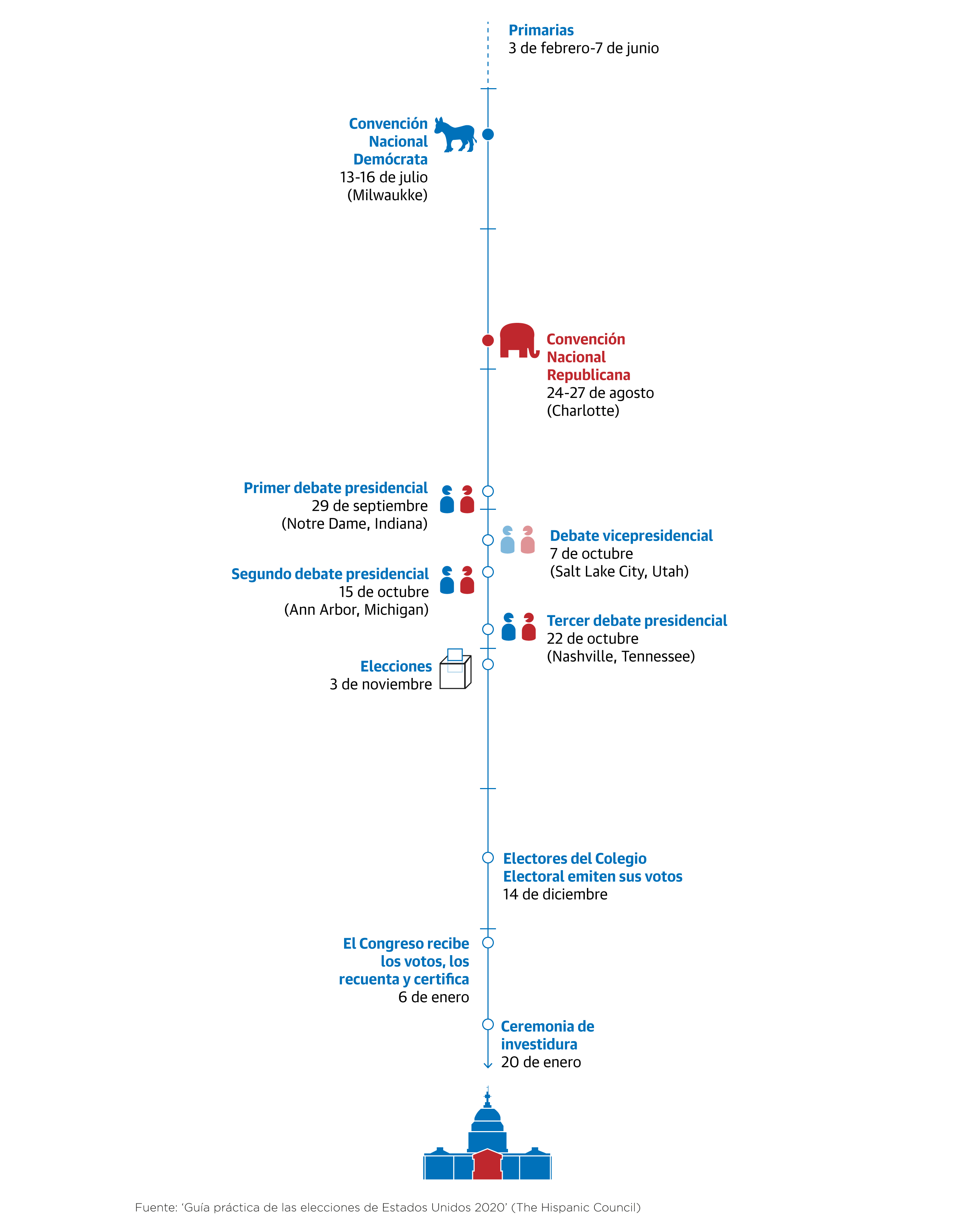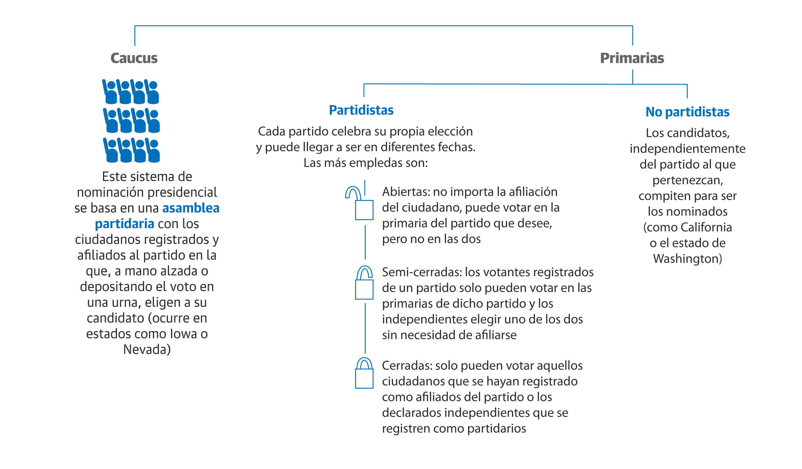 En Estados Unidos, antes de la elección presidencial hay un paso previo en el que se escogen a los que serán los candidatos. Cada partido, Republicano y Demócrata, realiza un proceso de primarias o caucus que se celebran a lo largo del primer semestre del año en los diferentes estados del país. Es un sistema de nominación que fomenta la competitividad entre aspirantes. De estas primarias sale un candidato por cada uno de los partidos que se convierte en el aspirante a la presidencia de las elecciones que se celebrarán en noviembre. La primera de estas jornadas se llevó a cabo en Iowa en 3 de febrero y sirve como referencia para el resto del proceso.