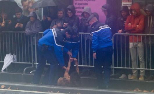 Trump y Putin acudieron por su cuenta al Arco del Triunfo por razones de seguridad mientras sus demás colegas se trasladaron juntos en autobús y luego a pie guarecidos bajo paraguas negros desde el palacio del Elíseo, donde fueron recibidos a pie de escalinata por el matrimonio Macron. Tres militantes del movimiento feminista Femen fueron detenidas por forzar el dispositivo de seguridad al paso del cortejo presidencial estadounidense por los Campos Elíseos. Con los lemas 'hipocrisy parad' y 'gangsta party' lucidos a pecho descubierto, saltaron las barreras y trataron de acercarse a Cadillac One, el mismo coche blindado y contaminante que la víspera había ahumado con su tubo de escape a los Macron y los Trump cuando se despedían tras almorzar en el Elíseo.