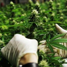 Un agente de policía examina una planta de marihuana.
