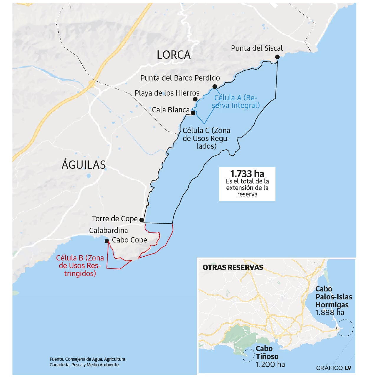 El área de máxima protección en la futura Reserva Marina de Interés Pesquero de Cabo Cope, en el litoral de Águilas y Lorca, estará vetada ... al fondeo de embarcaciones: los barcos podrán atravesarla a una velocidad inferior a cinco nudos –por debajo de tres nudos en el caso de las motos de agua– pero no podrán atracar en la franja comprendida entre la Punta del Barco Perdido, la playa de los Hierros y Cala Blanca. El Gobierno regional ya ha ultimado el decreto que regula los usos en este nuevo espacio protegido, documento que saldrá mañana a exposición pública en el boletín oficial y el Portal de Transparencia.