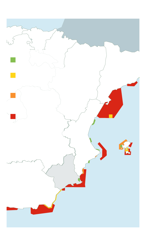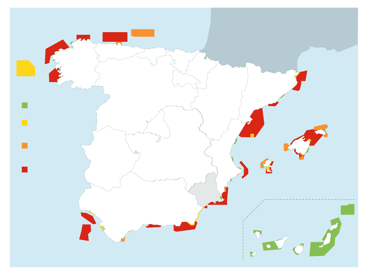 España tiene la obligación de designar nuevas áreas marinas protegidas hasta alcanzar el 30% para 2030, incluyendo un tercio (10%) con protección estricta. Actualmente se cuenta con un 8,01% de superficie marina protegida dentro de la Red Natura 2000 –el 12,23% sumando el Corredor de Cetáceos del Mediterráneo–. Y solo un 0,2% de protección estricta, correspondiente a las zonas integrales de las Reservas Marinas de Interés Pesquero.