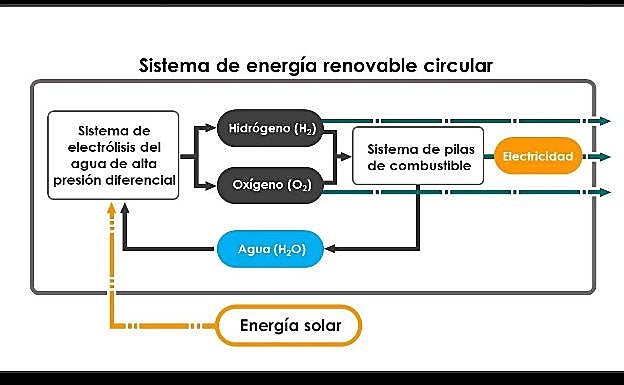 El sistema de energía renovable circular combina un sistema de electrólisis de agua a alta presión diferencial y un sistema de pilas de combustible, y está diseñado para producir oxígeno, hidrógeno y electricidad de forma constante a partir de energía solar y agua.