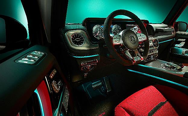 El interior se caracteriza por el contraste entre negro y rojo. Los umbrales de las puertas de acero inoxidable con la inscripción AMG iluminada en rojo dan la bienvenida al conductor. A juego, las alfombrillas AMG negras de terciopelo de alta calidad presentan costuras de contraste rojas y la inscripción 'Edition 55' tejida en rojo.