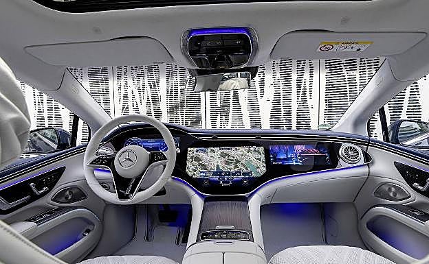 A pesar del despliegue técnico en el apartado eléctrico lo que más impresiona del Clase S eléctrico, o EQS, no es su diseño exterior o autonomía, sino la fiesta tecnológica del interior. Todo el tablero está ocupado por el sistema 'hyper-screen' con tres pantallas de información. La del cuadro de mandos es la ya conocida en Mercedes, y se añade una central de 17,7 pulgadas y otra para que el pasajero pueda consultar todo tipo de datos. La central es una maravilla tecnológica, con mapas en tiempo real enormes que se combinan con imágenes de la cámara delantera, y un climatizador, radio y equipo muy fácil de usar, con iconos grandes, posibilidad de control por voz y un funcionamiento sencillo. Mercedes abandona al el mando central en la consola, que reduce su tamaño y se convierte en un depósito donde guardar objetos. El sistema, desarrollado por el equipo dirigido por el ingeniero Mathias Pol, con el que departimos en profundidad, se ha desarrollado en secreto y supone un paso adelante significativo respecto a los sistemas actuales del mercado.