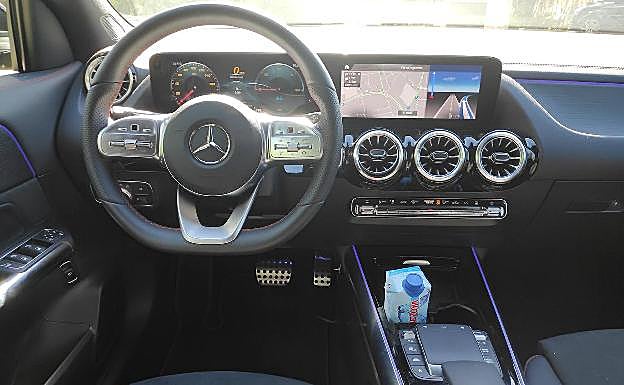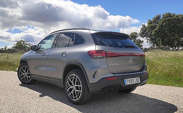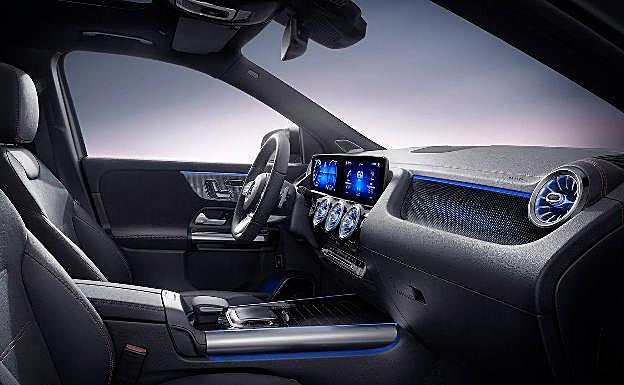 En el interior los cambios respecto al GLA son más sutiles que en el exterior. Se aprecian, por ejemplo, diferentes molduras, y un dibujo luminoso frente al copiloto, aunque la instrumentación se muestra igualmente en dos grandes pantallas de 10,25 pulgadas (de serie son de 7,5 pulgadas). El navegador, además, ha sido mejorado con una nueva funcionalidad denominada Electric Intelligence, que calcula la ruta que lleva con mayor rapidez al destino indicado teniendo en cuenta las fases de recarga de la batería -y deriva, si es necesario, a un punto de carga cercano, al que además el conductor se puede conectar con la aplicación Mercedes me Charge, con 450.000 tomas en toda Europa). El espacio es idéntico al del GLA, salvo en el maletero, que decae de 435 a 340 litros y debe además albergar el cable de recarga -para ello se ha instalado un espacio dedicado bajo el piso-.
