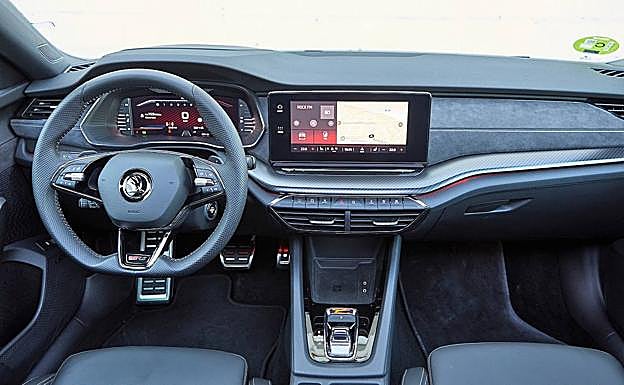 El interior del nuevo Octavia RS es también predominantemente negro. Los asientos deportivos ergonómicos con tapicería en tejido Alcántara y cuero son opcionales. El cuadro de instrumentación Virtual Cockpit y el asistente digital vienen de serie. El volante deportivo multifunción de tres radios luce el logo RS y dispone también de levas de cambio de marchas. Los asientos deportivos delanteros con reposacabezas integrados están tapizados con tela negra. Las costuras rojas de los asientos y del salpicadero ofrecen un gran contraste. Los asientos ergonómicos con ajuste de profundidad y función masaje son opcionales. Los modelos RS del Octavia ahora vienen con un innovador airbag central situado entre los dos asientos delanteros, que reduce el riesgo de impacto entre el conductor y el acompañante, especialmente en caso de colisión lateral; este nuevo airbag está situado en el interior del respaldo del asiento del conductor.