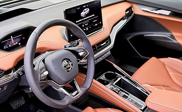 En el interior, Skoda ha sustituido los clásicos niveles de acabado por las denominadas «Selecciones de Diseño», una nueva y clara estructuración de las opciones disponibles para configurar el coche de forma individual: hay diponibles 11 paquetes temáticos, así como algunas opciones individuales, que permiten configurar el vehículo de forma rápida y fácil. El monitor central de 13 pulgadas es la pantalla más grande jamás equipada por un modelo de la marca checa. El nuevo Digital Cockpit mide 5,3 pulgadas; un head-up display es otra de las opciones disponibles. En este caso, se utiliza por primera vez realidad aumentada para proporcionar al conductor información sobre el parabrisas aún más precisa, para que no tengan que apartar los ojos de la carretera. La carga de la batería y el aire acondicionado pueden controlarse de forma remota a través de la aplicación My ŠKODA.