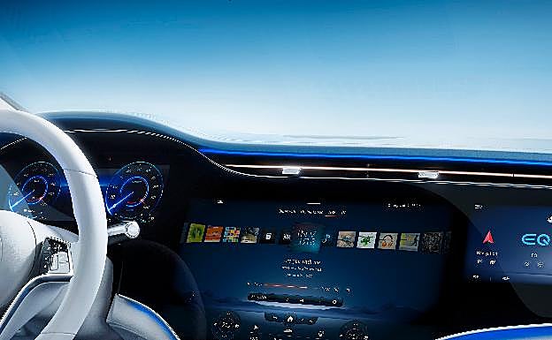 -MBUX Hyperscreen: El equipo más llamativo del interior del vehículo es, sin duda, la innovadora MBUX Hyperscreen. Esta pantalla abombada de grandes dimensiones se extiende con elegancia de lado a lado, prácticamente entre los dos montantes delanteros. Tres pantallas situadas por detrás de una cubierta de cristal adherida se funden a la vista en un solo visualizador. Los tres visualizadores de la MBUX Hyperscreen (equipo opcional) están yuxtapuestos casi sin solución de continuidad, configurando una impresionante banda visual de más de 141 centímetros de anchura. Se trata del visualizador del conductor (con pantalla de 12,3 pulgadas de diagonal), el visualizador central (17,7 pulgadas) y el visualizador del acompañante (12,3 pulgadas), que configuran una unidad óptica.