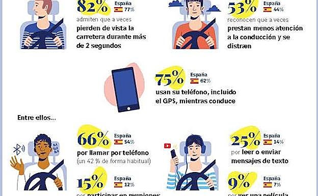 El 75% de los europeos utilizan el teléfono al volante, lo que engloba todo tipo de uso, incluida la utilización del GPS (62 % de los españoles). En España, el 55% confiesa usarlo para hacer llamadas de teléfono, un 46% utilizando el sistema de manos libres, y un 13% sujetándolo con la mano. El 14% reconoce que lee o envía mensajes mientras conducen, e incluso un 12 % lo utiliza para mantener reuniones de trabajo al volante.