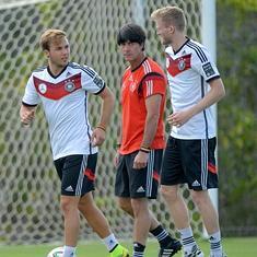 Joachim Löw (c), Mario Goetze (i) y Andre Schürrle (d), en un entrenamiento.