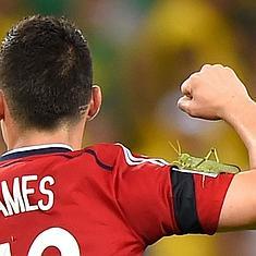 James Rodríguez, después de tirar un penalti, con un saltamontes en su brazo.