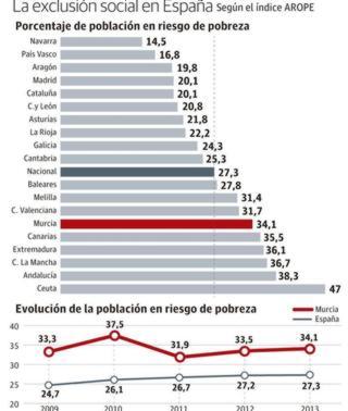 El estudio recoge la evolución entre 2009 y 2013 en toda España, y refleja una creciente desigualdad entre clases sociales y territorios. Murcia es la quinta comunidad con mayor porcentaje de población en riesgo de pobreza. Solo Andalucía (38,3%), Castilla-La Mancha (36,7%), Extremadura (36,1%) y Canarias (35,5%) presentan peores tasas que la Región. La media nacional se sitúa en el 27,3%. EAPN, que engloba a las principales ONG (desde Cáritas a Cruz Roja), utiliza para llegar a estas cifras el denominado índice Arope, elaborado por la Unión Europea para medir de forma estandarizada en todo el continente la pobreza y exclusión social. La tasa tiene en cuenta elementos de renta, consumo y empleo.