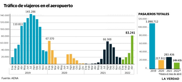 El aeropuerto de la Región de Murcia -que pasará a llevar el nombre del inventor del autogiro Juan de la Cierva- recuperó en abril el 75% de los pasajeros y el 85% de las operaciones de vuelos que tuvo en el mismo mes del año anterior a la pandemia, por lo que mantiene la senda del incremento progresivo de su actividad y del sector turístico en general pese a la guerra en Ucrania. El dato más representativo de dicha recuperación es que en este cuatrimestre se han transportado más de la mitad de viajeros que durante todo el año pasado, mayoritariamente turistas.