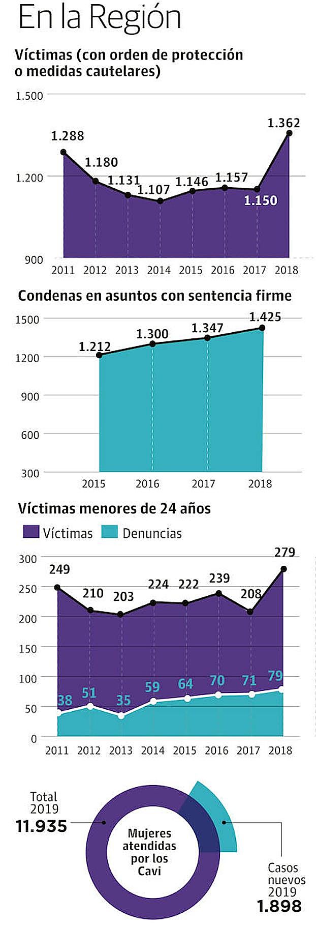 La violencia machista no es un cuento. Las cifras del Instituto Nacional de Estadística (INE) hablan por sí solas. La Región es la tercera comunidad con más víctimas por cada 10.000 mujeres, con una tasa del 85,9%, y la tercera en la que más denuncias se registran. En 2018 fueron 8.250, un 43,5% más que hace un lustro y un 5,2% más que en 2017. También es la sexta comunidad con más condenados por delitos de violencia de género: 1.425 en 2018. Un 15% más que hace cinco años. El Consejo General del Poder Judicial (CGPJ) registró, hasta junio de 2019, condenas sobre 788 hombres.