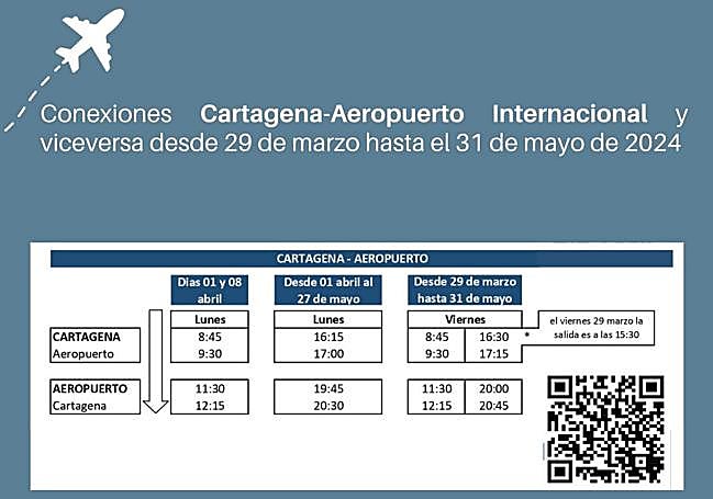 La Consejería de Fomento e Infraestructuras ampliará el horario de los autobuses del Aeropuerto de Corvera a las estaciones de autobuses de Murcia y de Cartagena, y viceversa. Así lo indicó el consejero, José Manuel Pancorbo, cuando se adelantó que el actual horario estaría en vigor hasta el 25 de marzo. De esta manera, será el próximo viernes, día 29, cuando comience el servicio con ampliación.