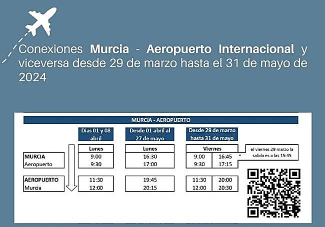 Los horarios, que hasta ahora sólo contaban con un traslado los lunes y otro los viernes a las dos principales ciudades de la Región, aumentarán a dos en el primer día de la semana y a cuatro el viernes hasta el final del mes de mayo. Desde la Consejería se recuerda que el precio del billete no aumenta y se mantiene en los 1,85 euros. Además, para más información los interesados pueden acceder al portal de Interbus Murcia.