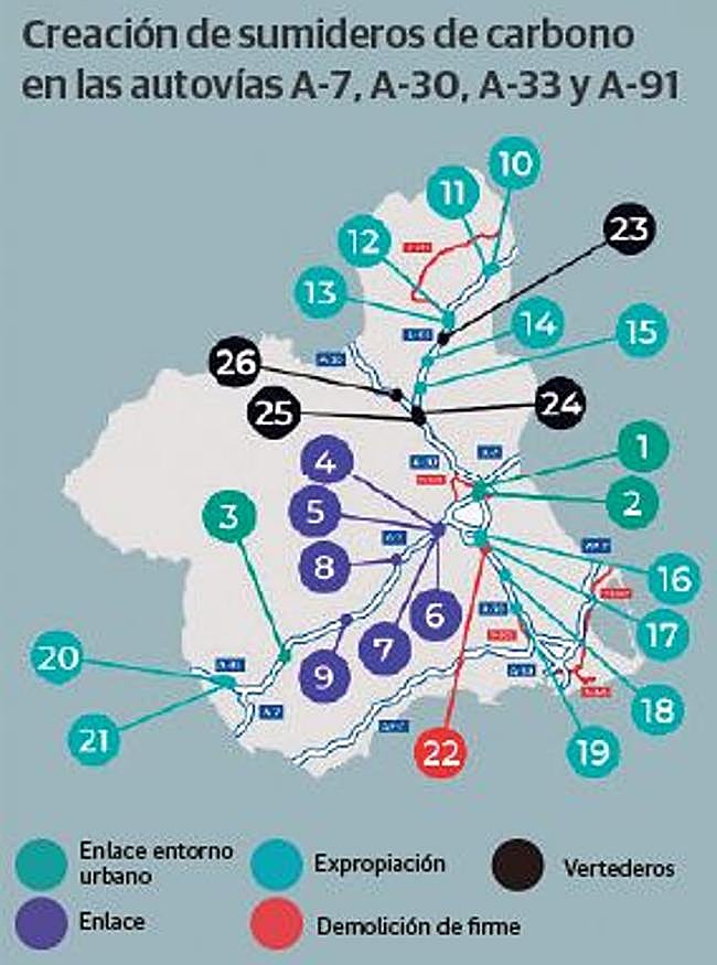 El entorno de las principales autovías que recorren la Región –A-7, A-30, A-33 y A-91– se teñirá de verde en los próximos meses tras adjudicar el Ministerio de Transportes y Movilidad el contrato de 2,7 millones de euros para plantar 67.800 árboles y arbustos en sus márgenes, lo cual permitirá absorber y capturar las emisiones de dióxido de carbono generadas por los vehículos que transitan por ellas, mitigando la contaminación y mejorando la calidad del aire.