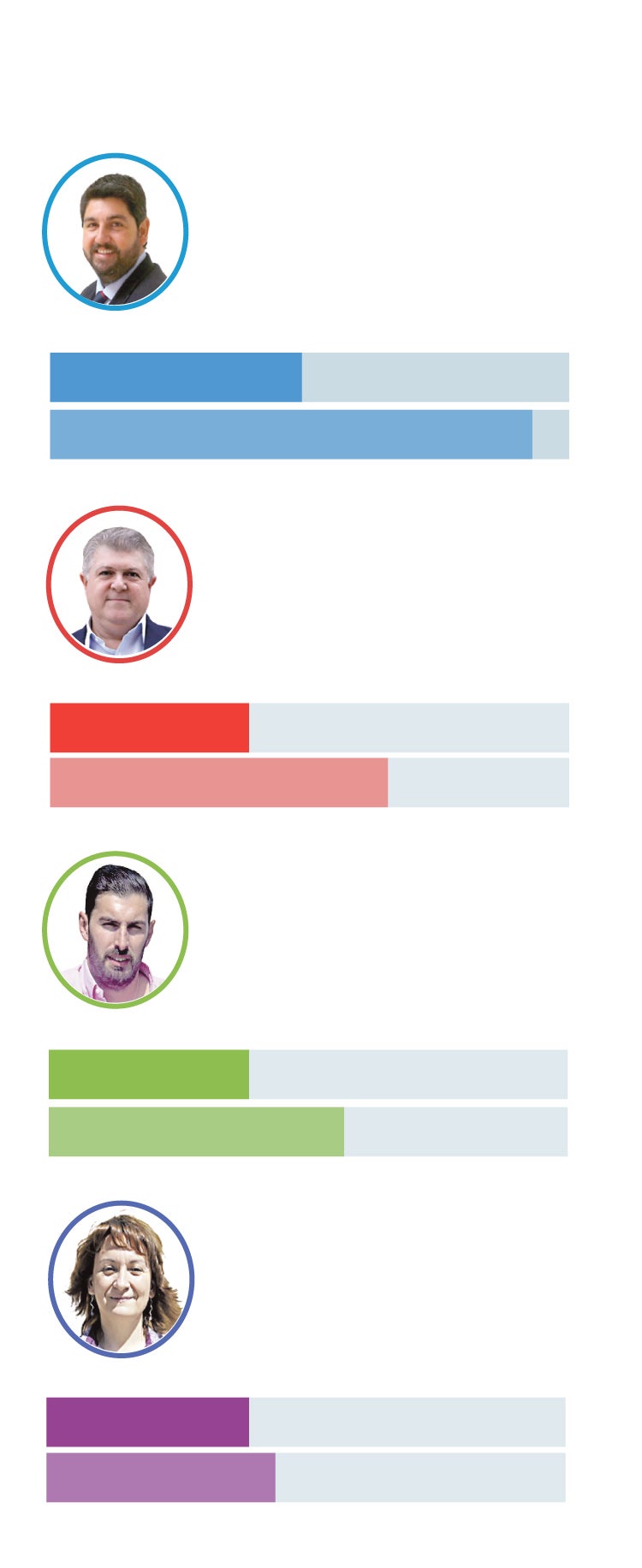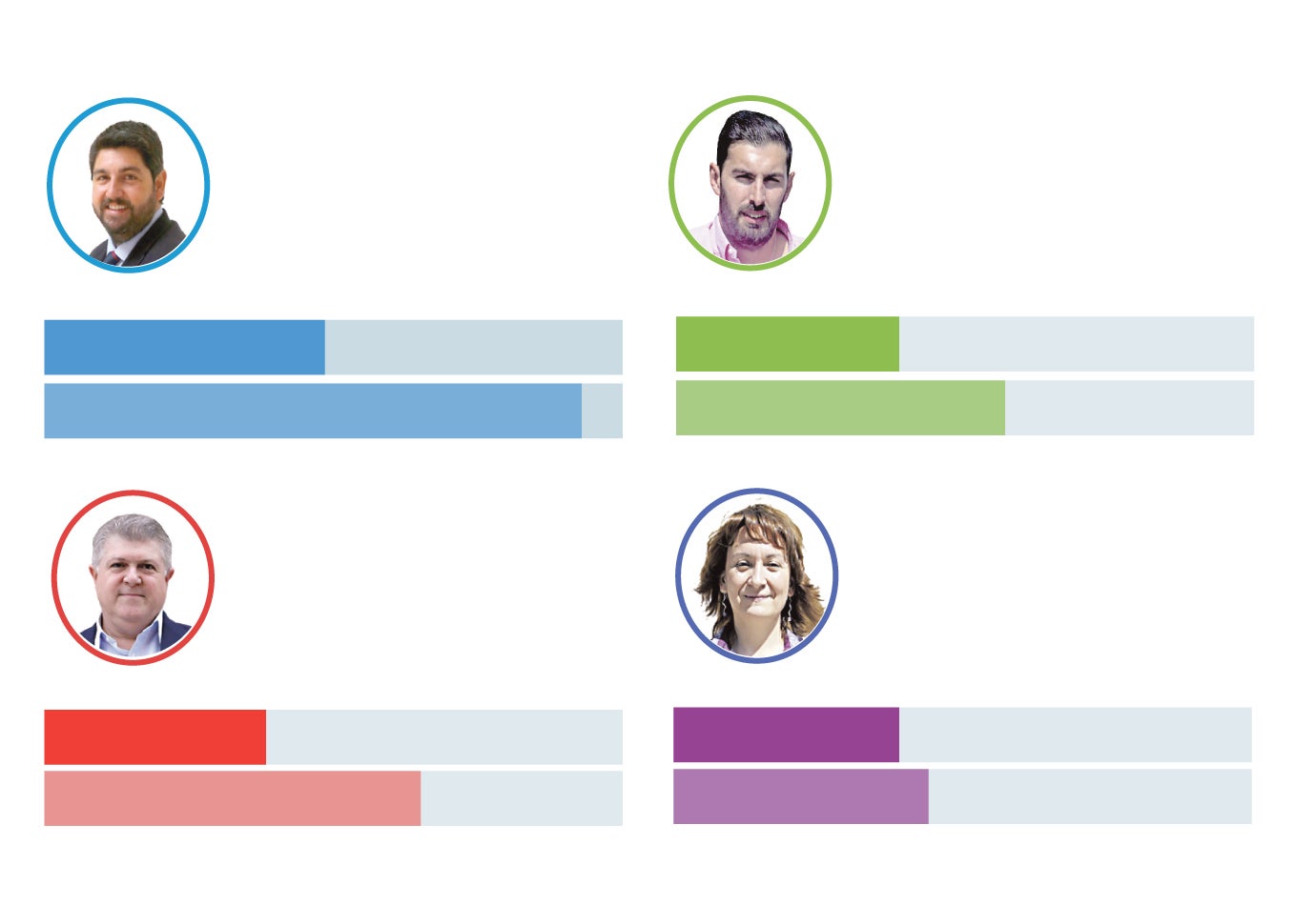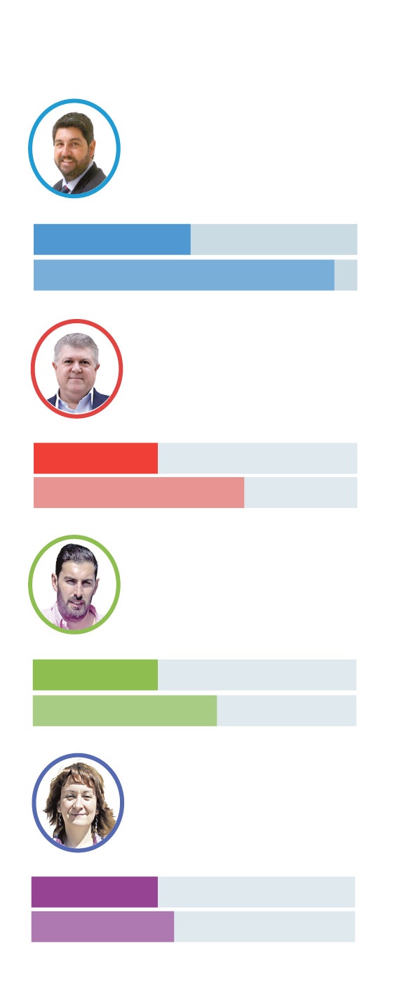 Entre los votantes de cada partido, los del PP le otorgan a López Miras un 6,7, Vélez recibe un 6,2 de valoración entre los suyos, y María Marín un 6,9 entre los de Podemos. Por su parte, José Ángel Antelo es el mejor valorado por los votantes propios, con un 7,5.