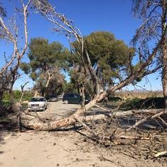 El temporal que sufre la Región está dejando un reguero de incidencias este fin de semana. En Cartagena, un pino derribado por el viento cayó a las 11.30 horas de la antigua carretera nacional 301 a la salida de El Albujón, pasado el desvío de Lobosillo, en dirección a Murcia.