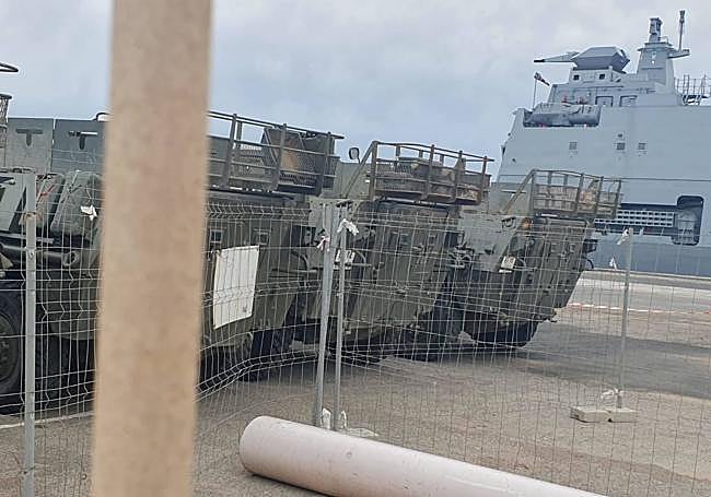El embarque comenzó por la mañana. Algunas piezas, sobre todo vehículos ligeros, ya estaban aparcados desde hacía varios días en el muelle de La Curra, aunque la mayoría llegó en a lo largo de la jornada desde la zona de prácticas militares. Algunas piezas, las más grandes, como los vehículos de combate 'Pizarro', llegaron por la autovía A-30 hasta la entrada al muelle de Santa Lucía cargados en los remolques de grandes camiones.