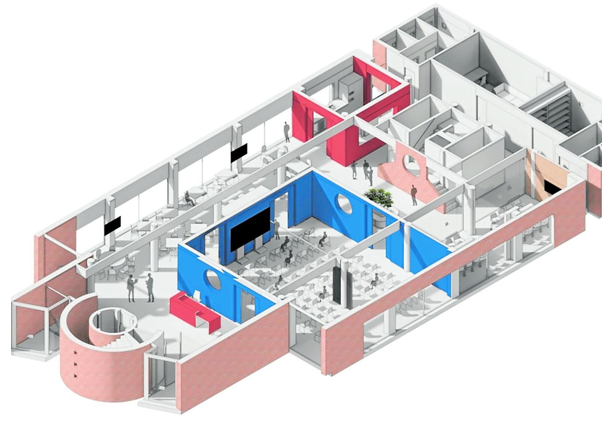 El edificio tiene una superficie de 1.062 metros cuadrados distribuidos en dos plantas. Está compuesto por una serie de espacios con distintos grados de privacidad adaptados a las diferentes actividades que se llevarán a cabo en el edificio. En él hay 22 puestos de trabajo, cuatro salas de reuniones, una cafetería, una sala de conferencias, tres almacenes, una sala de servidores, dos salas abiertas de colaboración, una recepción con sala de espera, dos despachos cerrados y una sala de grabación.