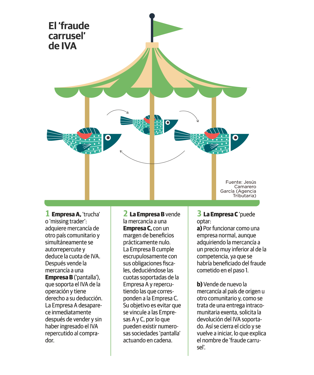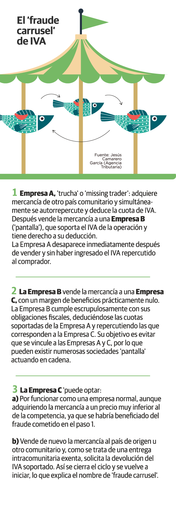 Este grupo desplegó presuntamente un 'fraude carrusel' del IVA. Este método básicamente consiste en el aprovechamiento perverso de las lagunas del actual régimen de tributación por IVA en las operaciones comerciales entre países de la UE. De forma que creando 'empresas fantasma' o 'sociedades pantalla' a nombre de testaferros –las llamadas 'truchas' o 'missing trader'– es posible obtener un suculento beneficio realizando o simulando adquisiciones de mercancías entre diferentes países comunitarios, en las que se va repercutiendo y deduciendo el IVA sucesivamente. Con la particularidad de que una de esas 'truchas' o 'empresas pantalla' debe extinguirse en el momento oportuno y dejar de abonar ese impuesto, dejando el consabido agujero en las arcas públicas.