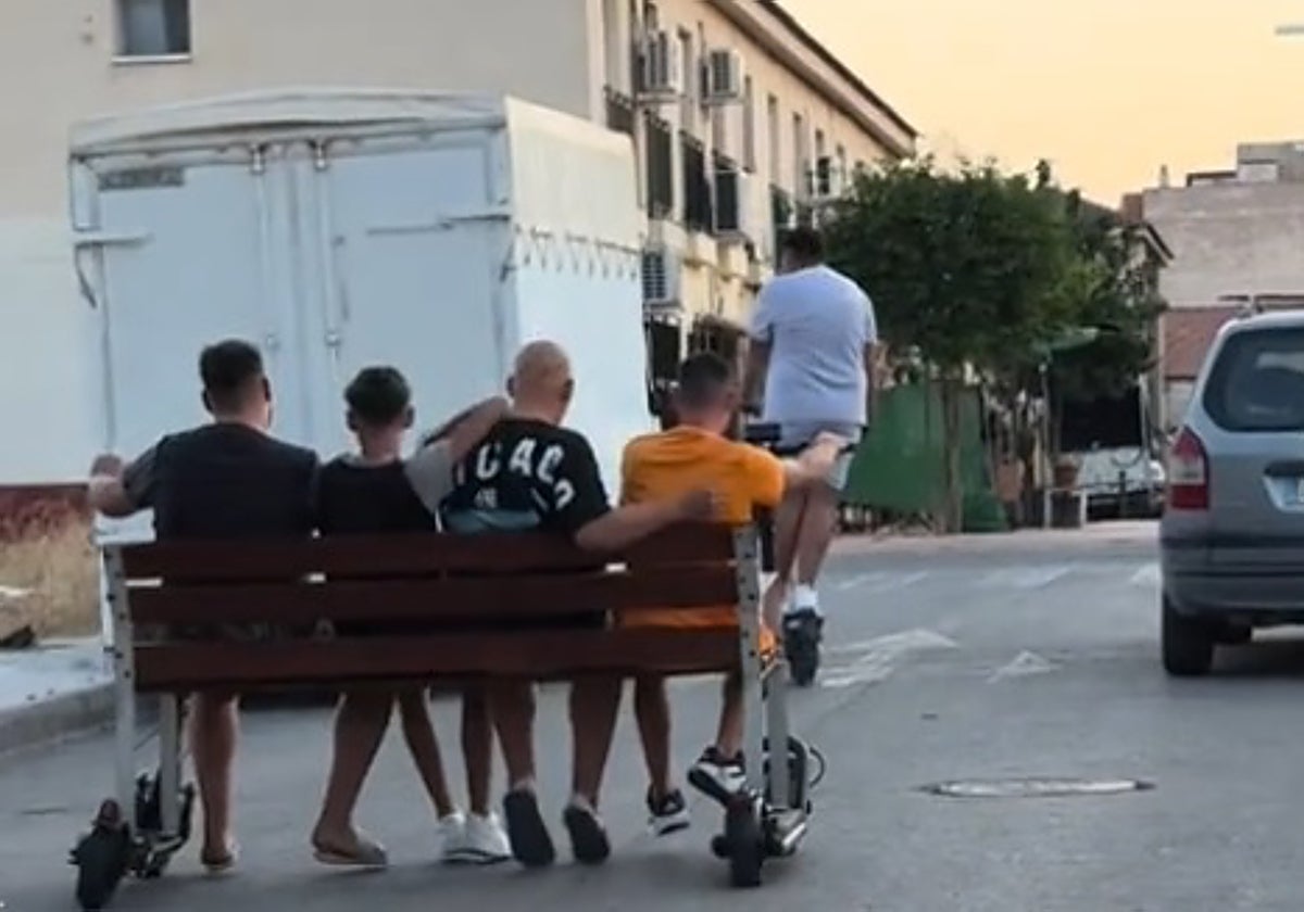 Vecinos del barrio de Espinardo, en Murcia, han mostrado su indignación tras ver un vídeo subido a una red social en el que cuatro jóvenes, algunos de ellos menores de edad, se pasean sentados en un banco arrancado de la vía pública y al que le han colocado dos patines eléctricos en ambos lados para desplazarse. La escena la acompaña la canción 'Los coches chocones' del grupo Los Desgraciaus.