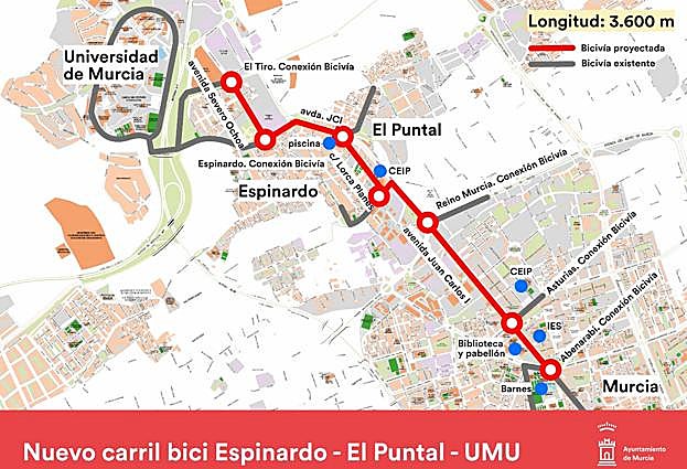 Esta actuación está comprendida dentro de la ejecución del nuevo carril bici hacia el Campus de Espinardo, que tendrá un trazado de 3,6 kilómetros y que completará el actual itinerario, que queda interrumpido a la altura del cruce de El Puntal, con el riesgo que esto suponía para los ciclistas, debido a la importante afluencia de tráfico rodado en ese tramo. De esta forma, el nuevo carril bici segregado conectará la institución educativa con el centro urbano, enlazando con los tramos ya existentes en Abenarabi y en el centro comercial Myrtea, pasando por la calle Antonio Rocamora, Lorca Planes, Cayetano Gago Regidor y Severo Ochoa.