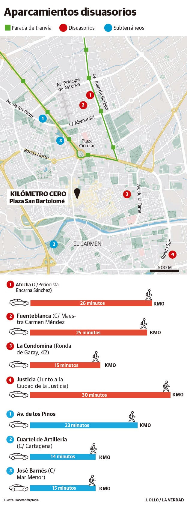 El Ayuntamiento de Murcia se ha propuesto sacar los coches del casco urbano y para ello tira de argumentos para demostrar, y también convencer ... a vecinos y visitantes, de que hay alternativas a la ORA –un sistema que está siendo objeto de críticas estos días–, como la de utilizar los aparcamientos disuasorios u optar por algunos de los garajes subterráneos, tanto de concesión municipal como de gestión propia, con abonos mensuales para días laborables. En ambos casos, suman siete alternativas que, en total, disponen de casi 1.600 plazas y que, de media, distan unos veinte minutos a pie del centro (el 'kilómetro cero' se situaría en la plaza de San Bartolomé).