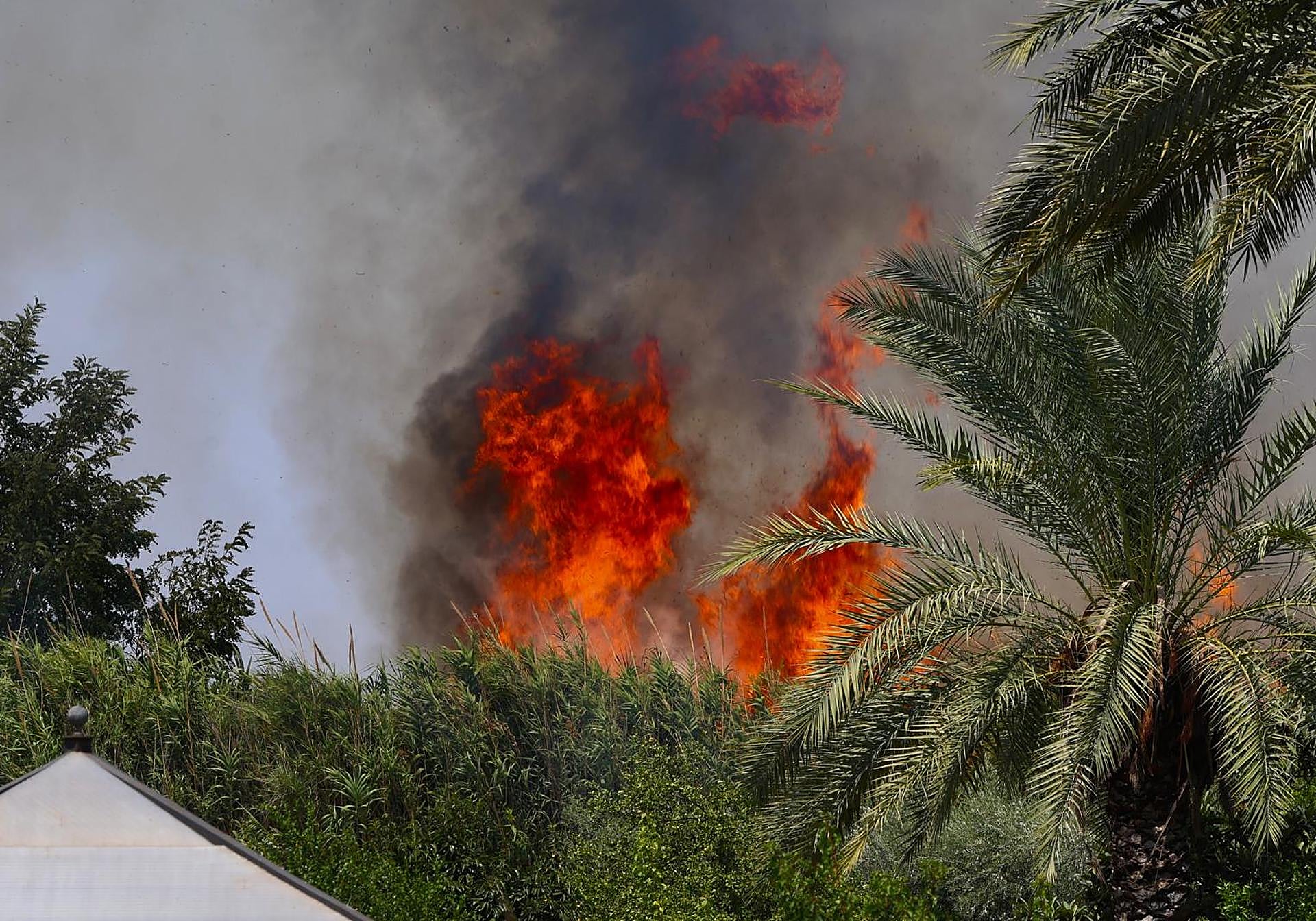 Efectivos de Emergencias trabajan para sofocar un incendio declarado poco antes de las tres de la tarde de este jueves en la pedanía murciana de El Palmar.