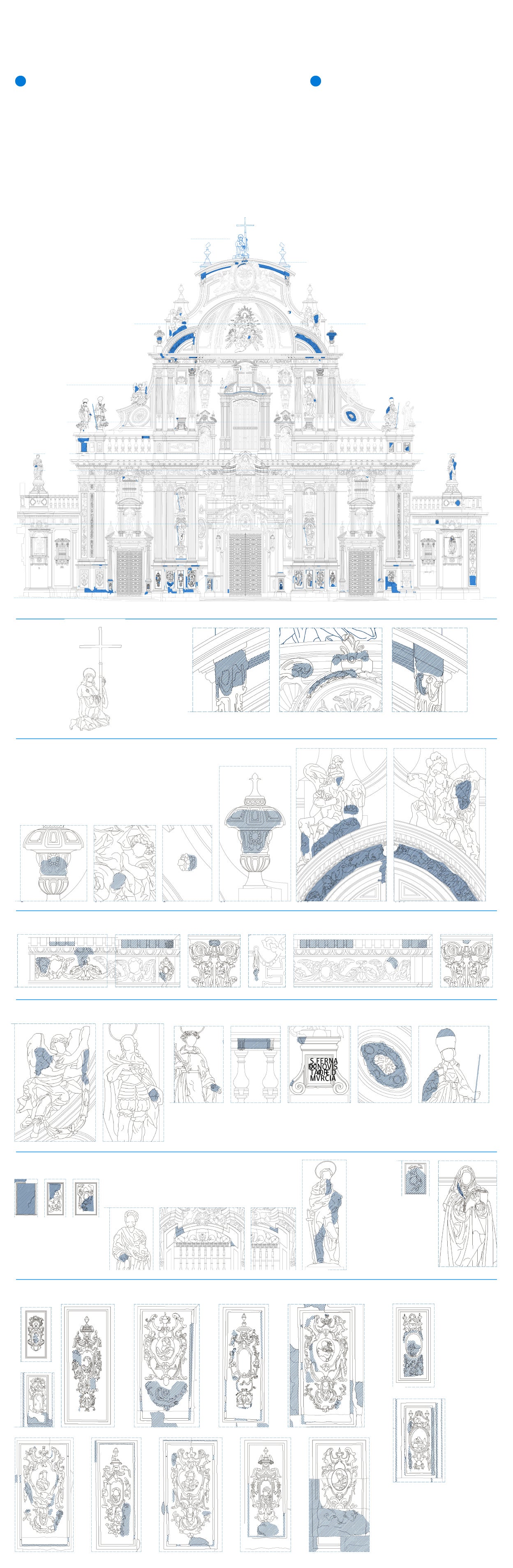 «Muchas de las esculturas han perdido algunos de sus atributos, como diademas, bordones báculos, varas..., que en su mayoría eran dorados», comenta el arquitecto. Añade que se ha valorado recuperar (en acero patinado) los báculos que portaban Santa Florentina, San Leandro, San Isidoro y San Fulgencio (los cuatros santos de Cartagena) de forma similar a los que conservan San Juan Bautista y San José.