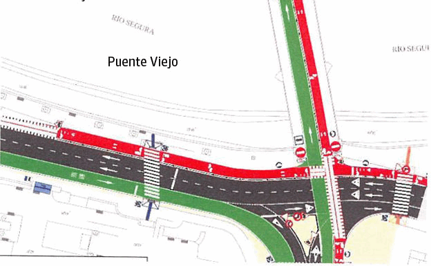 La principal novedad, además del cierre del Puente Viejo, estará en la pasarela Miguel Caballero, que cruza el río a la altura del instituto Francisco Cascales, junto a la Consejería de Hacienda. Este puente cambiará de sentido y quedará solo como la entrada para el tráfico privado desde el centro de la ciudad.