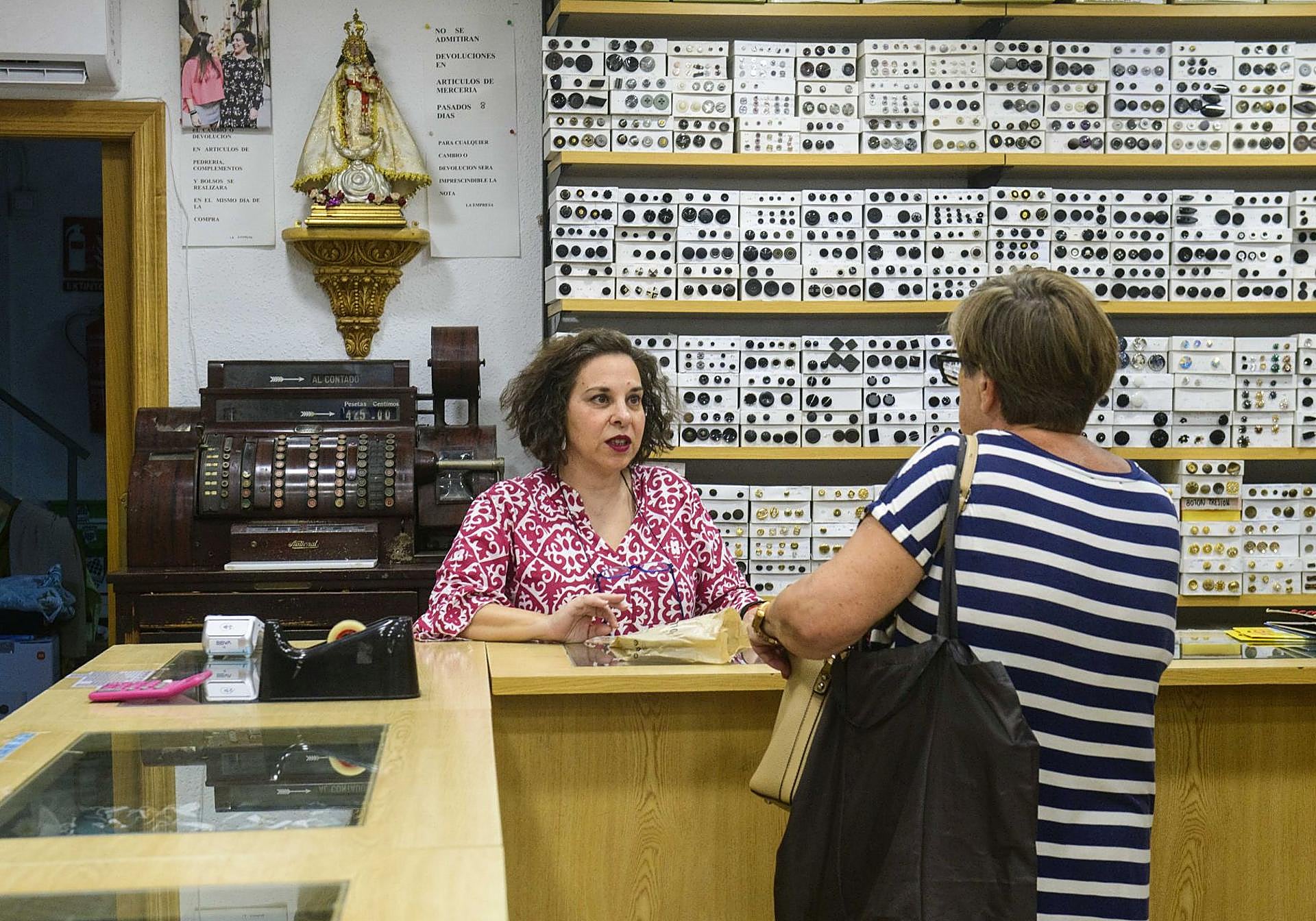 Pese a este escenario y esa posición de inferioridad, Josué insiste con optimismo en una receta de toda la vida: «Creo que el pequeño comercio, especializado y con calidad, sobrevivirá. Una buena carnicería, una buena pescadería, una buena panadería. Nosotros intentamos ofrecer la mayor calidad y gracias a Dios no nos podemos quejar». De hecho, los comercios que sobreviven son los que se diferencian de las grandes cadenas por su especialización. «Nuestro negocio, las grandes empresas no lo quieren, porque las ventas son muy pequeñas», razona Fuensanta en la mercería Amorós, con estanterías repletas de bobinas de hilo, rafia, flecos, imperdibles.