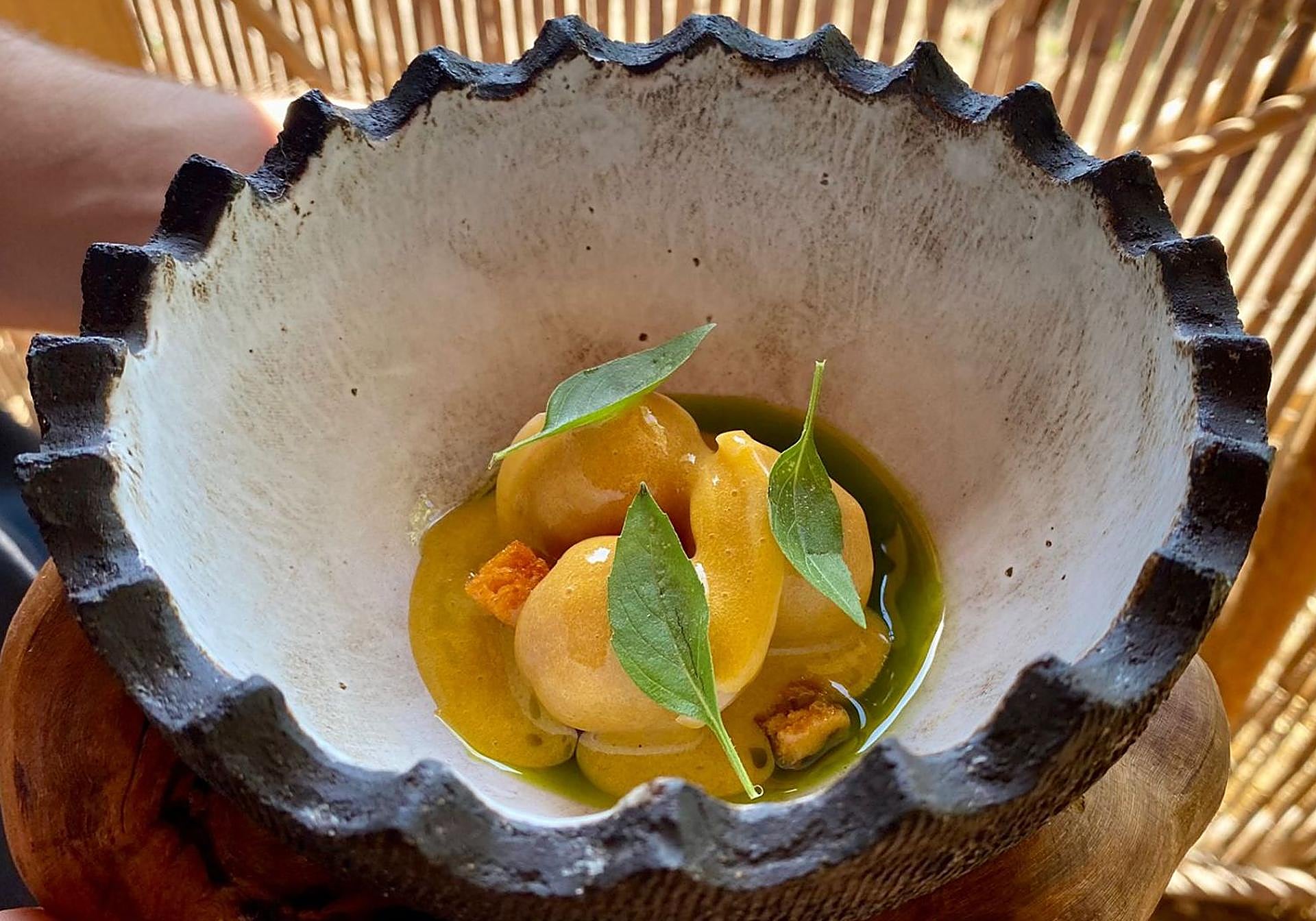 Con esos cherry, Iniesta demostró cómo se puede aprovechar al máximo para elaborar una ensalada murciana con tomates embotados por él mismo y que luego, ya en un sifón, sirve carbonatados. Con las pieles resultantes, elabora también un polvo de tomate seco para una trufa de queso de cabra. Y con el agua de la conserva, también es capaz de fermentar una bebida muy parecida a la kombucha. Aquí se aprovecha todo.