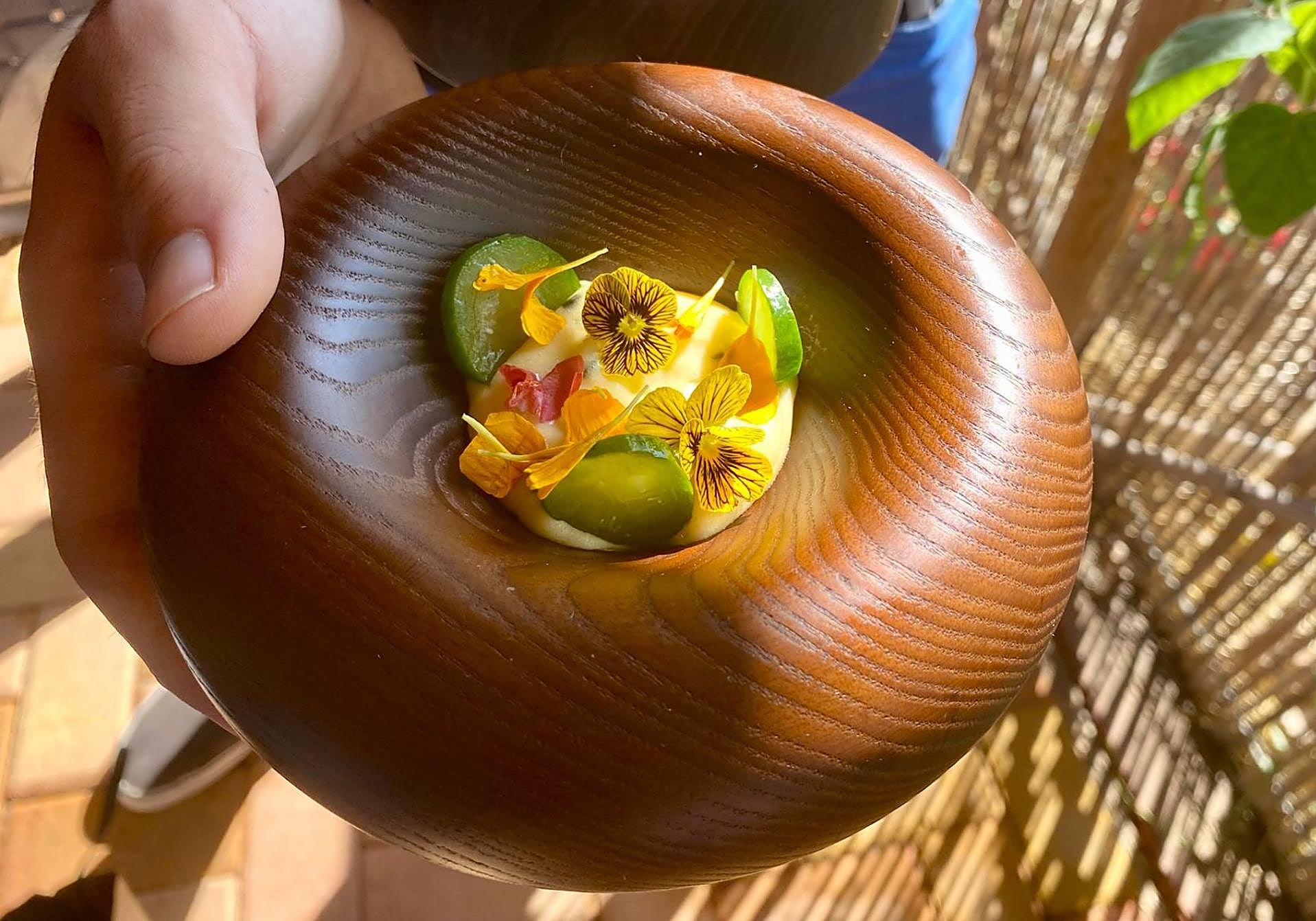Para Orenes, esta forma de cuidar los ingredientes y sacarles el máximo rendimiento es uno de los puntos fuertes de la cocina de Iniesta: «Mima los productos de la huerta». A su alrededor, limoneros, frutales, huertos y hierbas aromáticas evidenciaban la herencia de esa cocina que mantiene viva en los fogones de Frases.