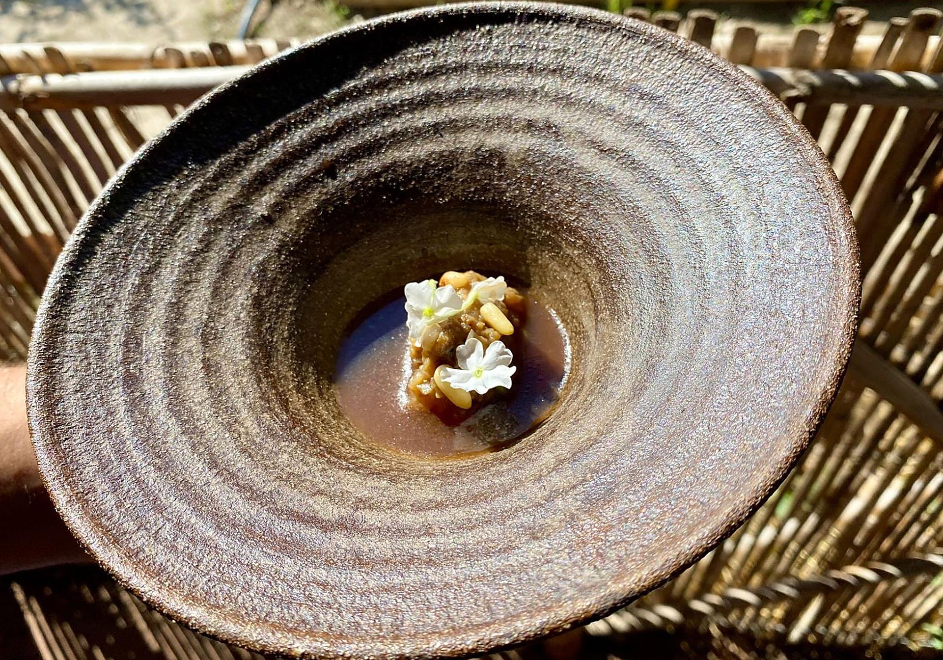 Para la morcilla de verano, por supuesto que la berenjena, la morcilla y la especias mantenían un protagonismo destacado, pero en este punto Iniesta sumó una olla coreana que permite elaborar una larga cocción a doble presión. Hasta 12 horas de es lo que contó que tarda para obtener el primer guiso de esta elaboración.