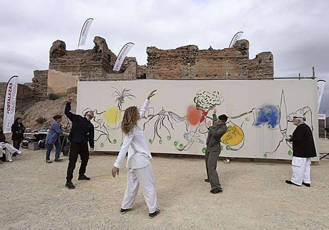 El pintor muleño protagoniza sobre un lienzo de 3x9 metros una 'performance' creativa y colectiva con el Castillejo de Monteagudo de Murcia como telón de fondo