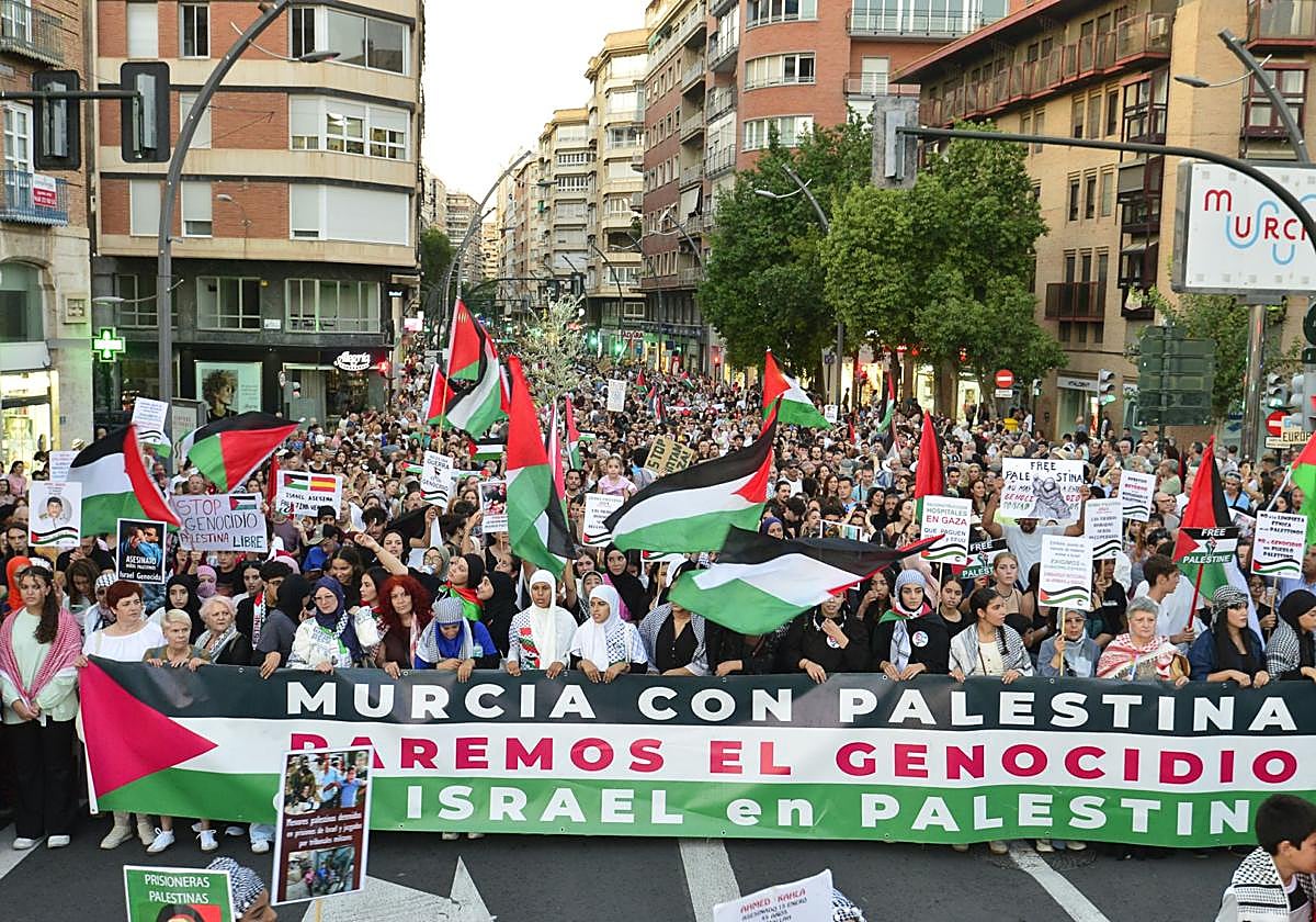 Una agradable sorpresa. Eso supuso para los asistentes el gran nivel de afluencia a la marcha desarrollada por el centro de Murcia contra el genocidio en Gaza y que se sumaba a las movilizaciones en otras 70 ciudades de España. Varios miles de personas llenaron buena parte de la Gran Vía para pedir el fin de los ataques a la población civil gazatí y una paz digna que respete los derechos del pueblo palestino, así como la liberación de los integrantes de la la flotilla apresados.