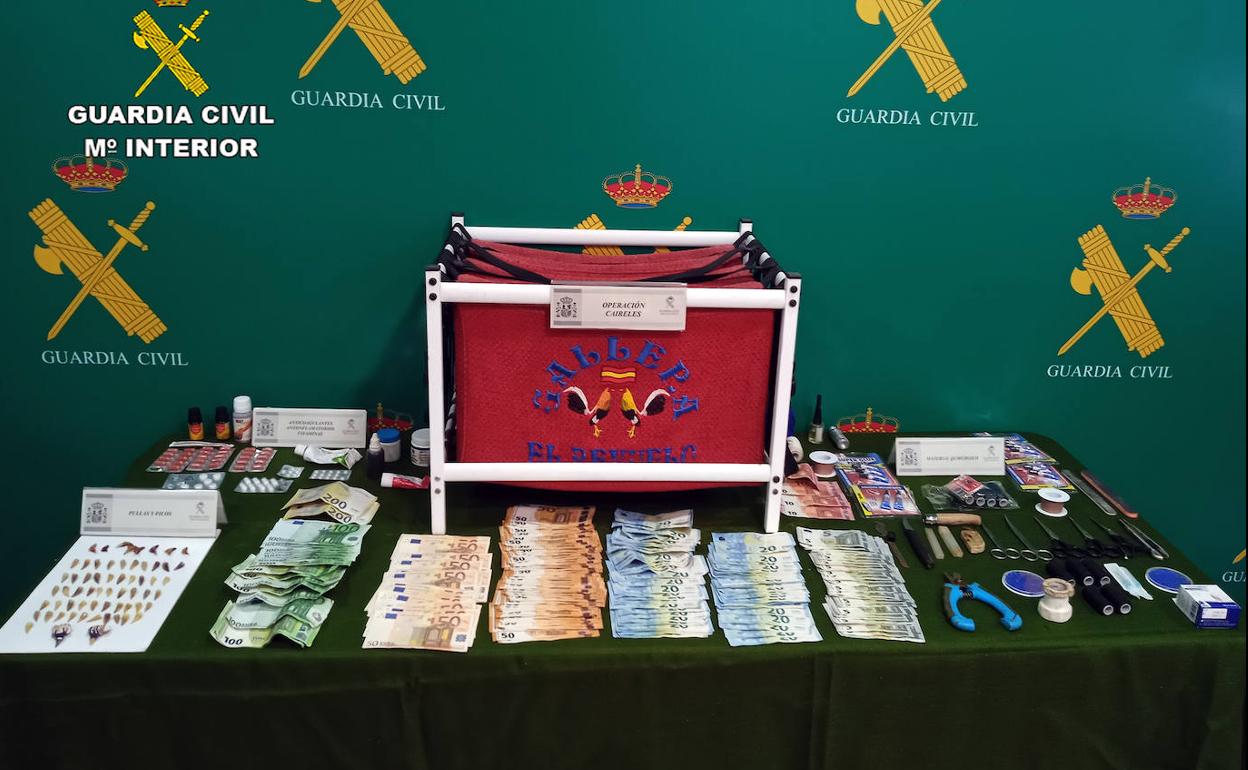 En el inmueble se localizaron 31 gallos, ocho de los cuales presentaban heridas graves ocasionadas, supuestamente, en el curso de las peleas, y se incautaron diversos medicamentos, complementos vitamínicos, material quirúrgico, utensilios para la preparación de los gallos para la pelea, así como 8.500 euros, supuestamente utilizados para las apuestas.
