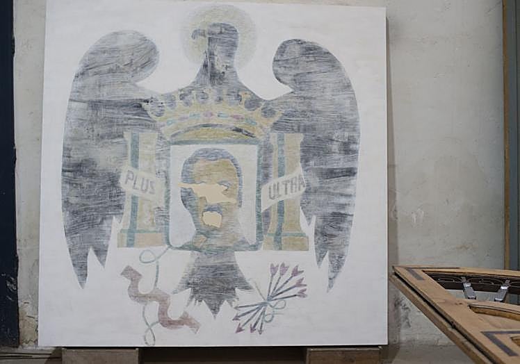 Especialmente llamativo es el mural con el escudo franquista que apareció en la pared de un despacho y que ha sido trasladado al taller mediante su transferencia a una tela, al estilo de lo que se hizo con las pinturas negras de Goya. «En el centro se aprecia lo que fue la cara del dictador Francisco Franco, pero esta fue golpeada y escondida a brochazos, posiblemente en actos vandálicos posteriores al cierre en 1981 de la prisión», explica Montse, sin saber dónde se reubicará posteriormente esta obra y que, en todo caso, precisará de una buena dosis de contexto.