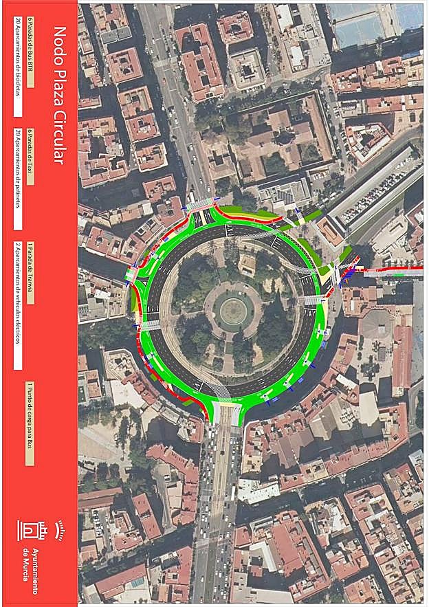 La actuación del nodo de la Plaza Circular se realizará en una superficie de 36.000 metros cuadrados. La nueva configuración supone la reducción de los carriles para el tráfico, ganando así espacio que se destina para la generación de andenes independientes para los autobuses urbanos, la reordenación del carril bici y bus para integrar las líneas BTR, y puntos de recarga y aparcamiento para patinetes y bicicletas eléctricas.