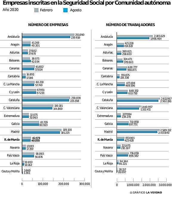 La capacidad de resistencia de los empresarios murcianos alcanza niveles inverosímiles a tenor de los enormes perjuicios que conlleva la pandemia del coronavirus. Las ... últimas estadísticas de empresas inscritas en la Seguridad Social, a fecha de 31 de agosto, reflejan que en seis meses las sociedades con trabajadores en la Región de Murcia han disminuido en 1.718, al pasar de las 42.573 computadas en el último día de febrero, antes de la declaración del estado de alarma –siendo en marzo el gran desplome–, hasta las 40.855 registradas el pasado mes.