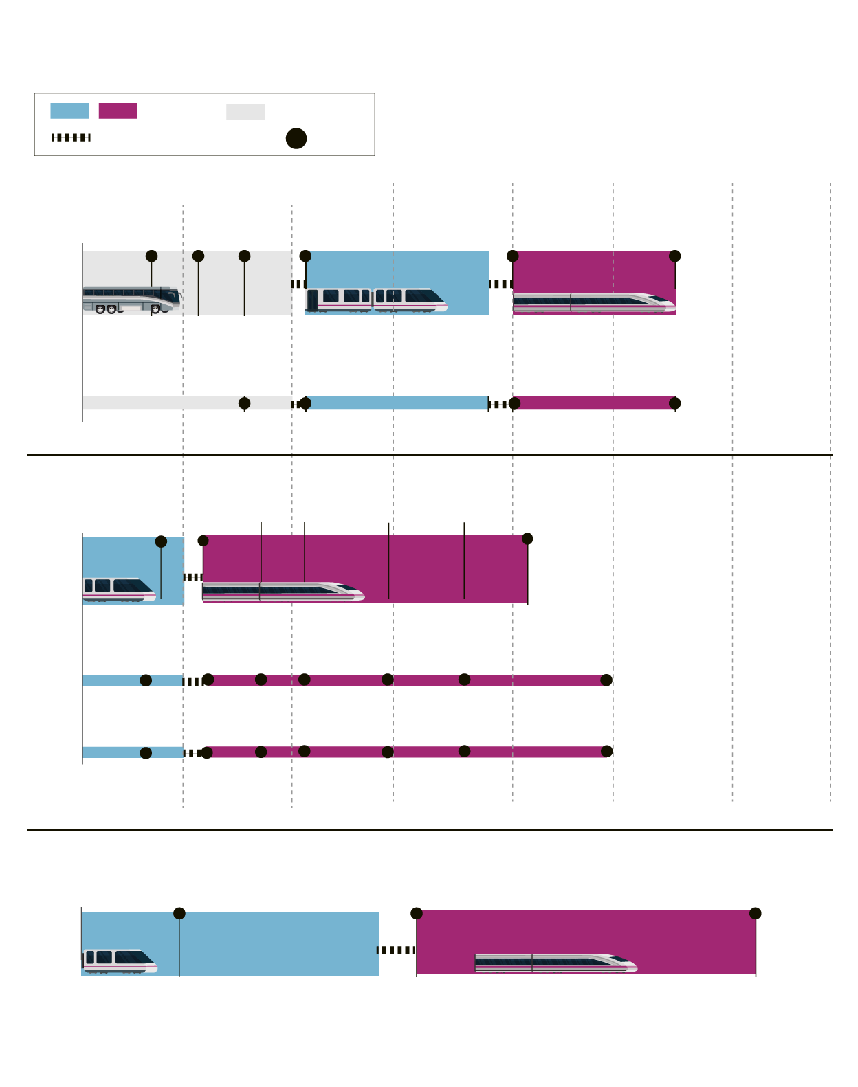 Adif y Renfe ofrecen tres posibilidades de realizar el trayecto de forma combinada: con autobuses por Archena, con lanzaderas por Orihuela y con transbordos en Alicante. A estas se suma ir en coche hasta Albacete. En estas cuatro modalidades utilizadas por los viajeros, el común denominador es que se suben y bajan del AVE allí donde lo tienen a mano; el inconveniente está en llegar hasta esos puntos.