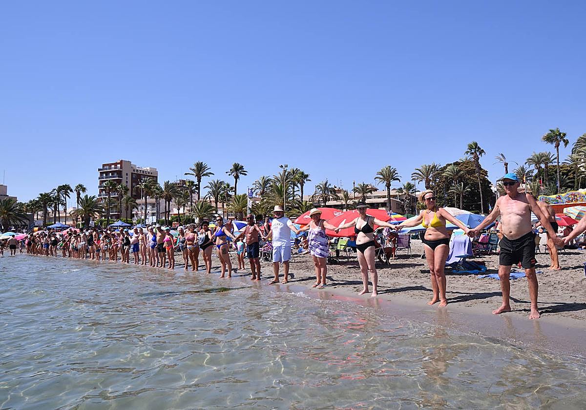 La lucha por la protección del Mar Menor sigue viva. Hoy lo han dejado patente en las playas los vecinos y veraneantes, que han unido sus manos alrededor de la laguna en respuesta a la llamada de los colectivos de defensa ambiental. Con desigual participación, el Mar Menor ha recibido su cuarto abrazo desde que comenzó esta acción divulgativa, que pretende unir emocionalmente a los ciudadanos con este ecosistema amenazado.