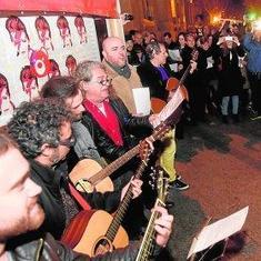 Aficionados a la música y seguidores de David Bowie se reunieron en la noche de ayer en la plaza de Santo Domingo de Murcia para rendir su particular homenaje a esta leyenda del rock. El encuentro, organizado a través de la redes sociales, animó a que los murcianos no se perdieran la oportunidad de despedir con una 'performance' musical al legendario Bowie.