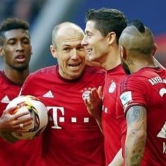 Con goles del brasileño Arjen Robben (11), del brasileño Douglas Costa (18), del polaco Robert Lewandoski (37) y Thomas Müller (40), el Bayern, que ya había goleado al Allianz Arena al Arsenal inglés el pasado miércoles en la Liga de Campeones, resolvió el partido del campeonato doméstico.
