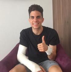 Operado la noche del martes de una fractura de radio a la altura de la muñeca derecha, Marc Bartra aseguró este miércoles encontrarse «mucho mejor» y quiso agradecer «a todo el mundo por los mensajes de apoyo» recibidos desde que el autobús del Borussia Dortmund fue objeto de un atentado cuando se dirigía al estadio Signal Iduna Park a disputar su partido contra el Mónaco. El futbolista español del Dortmund se recupera satisfactoriamente de las heridas sufridas y, a través de las redes sociales, este miércoles quiso lanzar un mensaje tranquilizador, junto a una fotografía en la que aparece con el brazo derecho inmovilizado y también con un vendaje en la muñeca izquierda, pero sonriente y con el dedo pulgar de dicha mano hacia arriba.