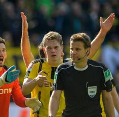 El árbitro alemán Felix Brych (d) dirige un partido de la Bundesliga.